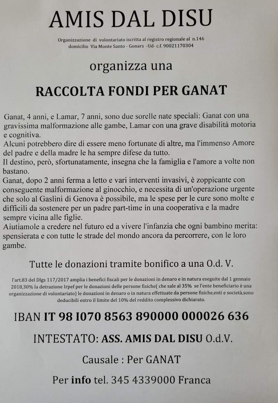 L'Associazione "Amis dal Disu" ha organizato una raccolta fondi per aiutare la famiglia della piccola Ganat, alunna del nostro Istituto Comprensivo, a sostenere le spese mediche per l'intervento di cui ha bisogno la bimba.