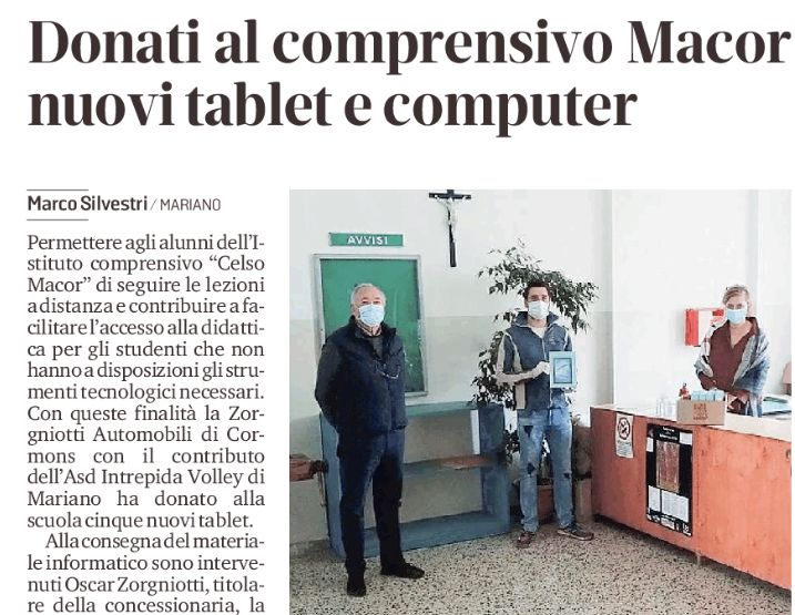 Permettere agli alunni dell'Istituto comprensivo "Celso Macor" di seguire le lezioni a distanza e contribuire a facilitare l'accesso alla didattica per gli studenti che non hanno a disposizioni gli strumenti tecnologici necessari. Con queste finalità la Zorgniotti Automobili di Cormons con il contributo dell'Asd Intrepida Volley di Mariano ha donato alla scuola cinque nuovi tablet. Alla consegna del materiale informatico sono intervenuti Oscar Zorgniotti, titolare della concessionaria, la preside dell'Istituto comprensivo Donatella Gironcoli, il sindaco di Mariano Luca Sartori, l'amministratore delegato dell'Asd Intrepida Francesco Zorgniotti e il professore di informatica Remo Emanuele. La preside ha ringraziato Oscar e Francesco Zorgniotti per la sensibilità avuta e la lodevole iniziativa che darà modo ad alcune famiglie di disporre di tutto il necessario per la continuità didattica. Grazie al professore Emanuele i dispositivi saranno attivati e la scuola garantirà la consulenza necessaria per seguire le lezioni. In questi giorni diventerà operativo nella scuola anche l'assistente tecnico informatico, messo a disposizione dal Ministero dell'Istruzione, che potrà dare supporto ai docenti per la didattica a distanza. L'Istituto comprensivo darà in comodato gratuito i cinque tablet. Questo materiale tecnologico si aggiunge ai 12 tablet e ad un computer, già messi a disposizione in precedenza per lo studio online degli studenti che ne sono privi. Inoltre ieri la scuola ha consegnato, tramite i volontari della protezione civile, anche 15 computer acquistati grazie al contributo ministeriale di 6. 500 mila euro. Durante la consegna è stato messa in rilievo anche la collaborazione tra la scuola e le realtà commerciali e associative presenti nel territorio. L'emergenza sanitaria ha penalizzato anche la stagione sportiva dell'Asd Intrepida Volley. Un vero peccato, anche perché le ragazze della squadra femminile e i bambini del minivolley avevano potuto nuovamente usufruire della palestra comunale "Luca e Massimiliano Tofful", rimessa a nuovo dopo lunghi lavori di restyling. (Piccolo 18/4/2020)